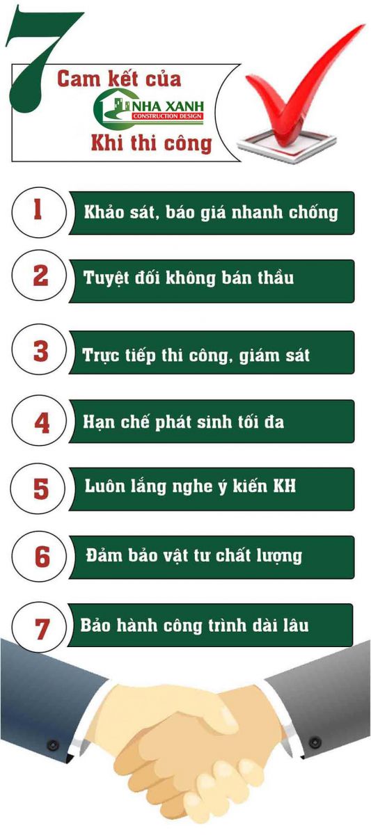 Chúng tôi luôn đặt chất lượng dịch vụ lên hàng đầu, đảm bảo tiêu chuẩn và 7 cam kết với khách hàng khi thiết kế và thi công.