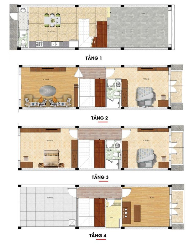 Ví dụ: Bạn có lô đất 4x15m có nhu cầu xây 1 trệt (gara xe, cầu thang, phòng bếp, WC), lầu 1 (Phòng khách, phòng ngủ, WC), lầu 2 (2 phòng ngủ, WC) Tầng thượng (Phòng thờ, kho, sân thượng)