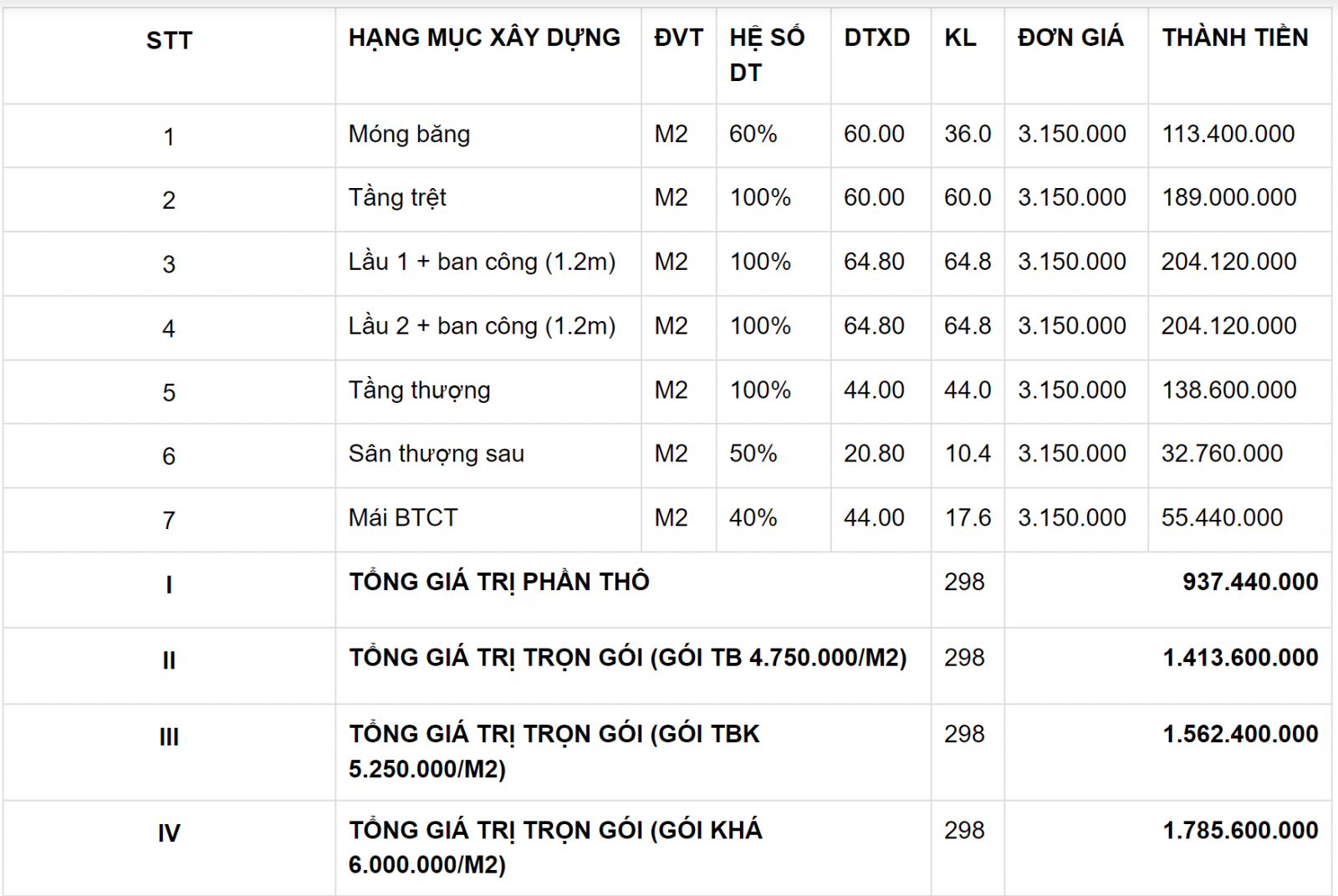 – Chi phí xây nhà trọn gói, gói Trung bình là 1,413,600,000đ